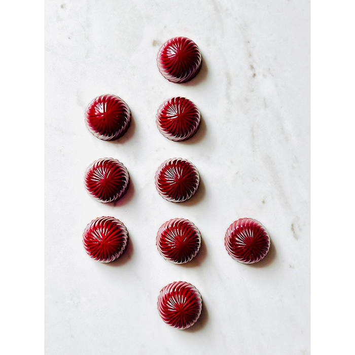 Ganasz z białej czekolady połączony z kwaśnymi owocami granatu, zamknięty w deserowej czekoladzie.