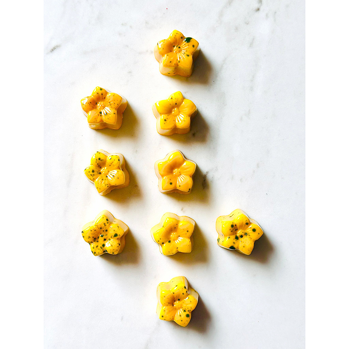 Pralina wypełniona jest chrupiącym owocowym ganaszem.
