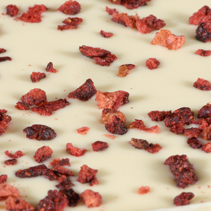 Kremowa biała czekolada połączona z wyrazistą liofilizowaną truskawką.