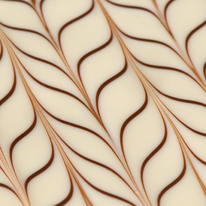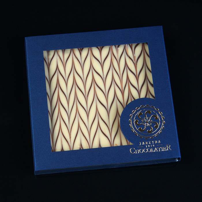 Wyjątkowo delikatna biała czekolada z ręcznie malowanymi wzorami czekoladą deserową.