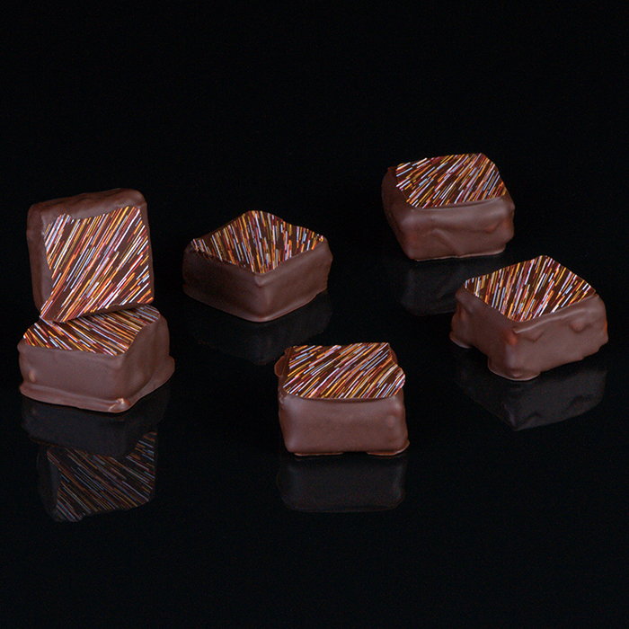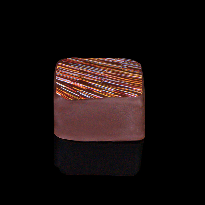 Cremino na białej czekoladzie, całość zatopiona w czekoladzie deserowej.
