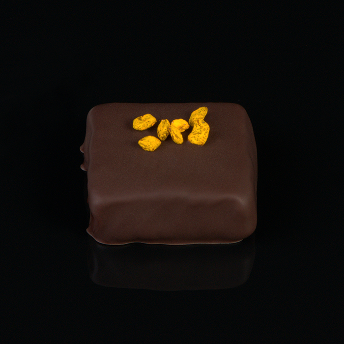 Mleczna czekolada połączona z marakują oraz karmelizowanym cukrem, całość otoczona czekoladą deserową.