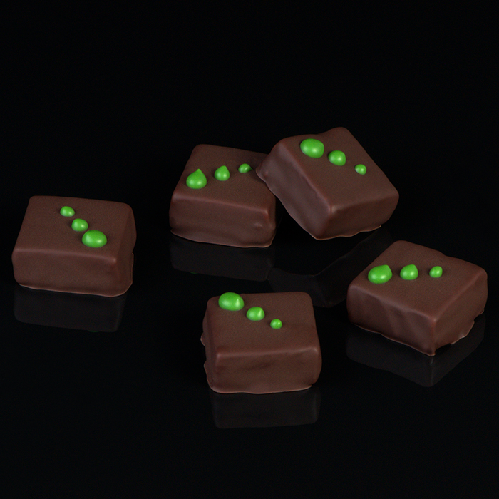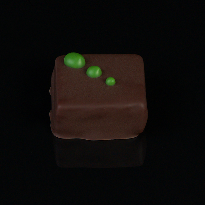 Biała czekolada połączona z miętą i sokiem z cytryny, całość otoczona czekoladą deserową.