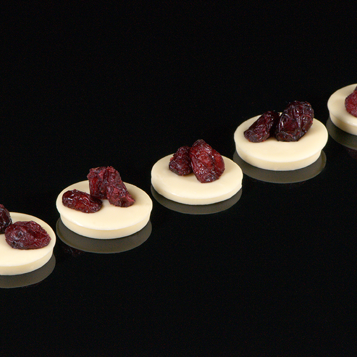 Biała czekolada udekorowana owocami żurawiny.